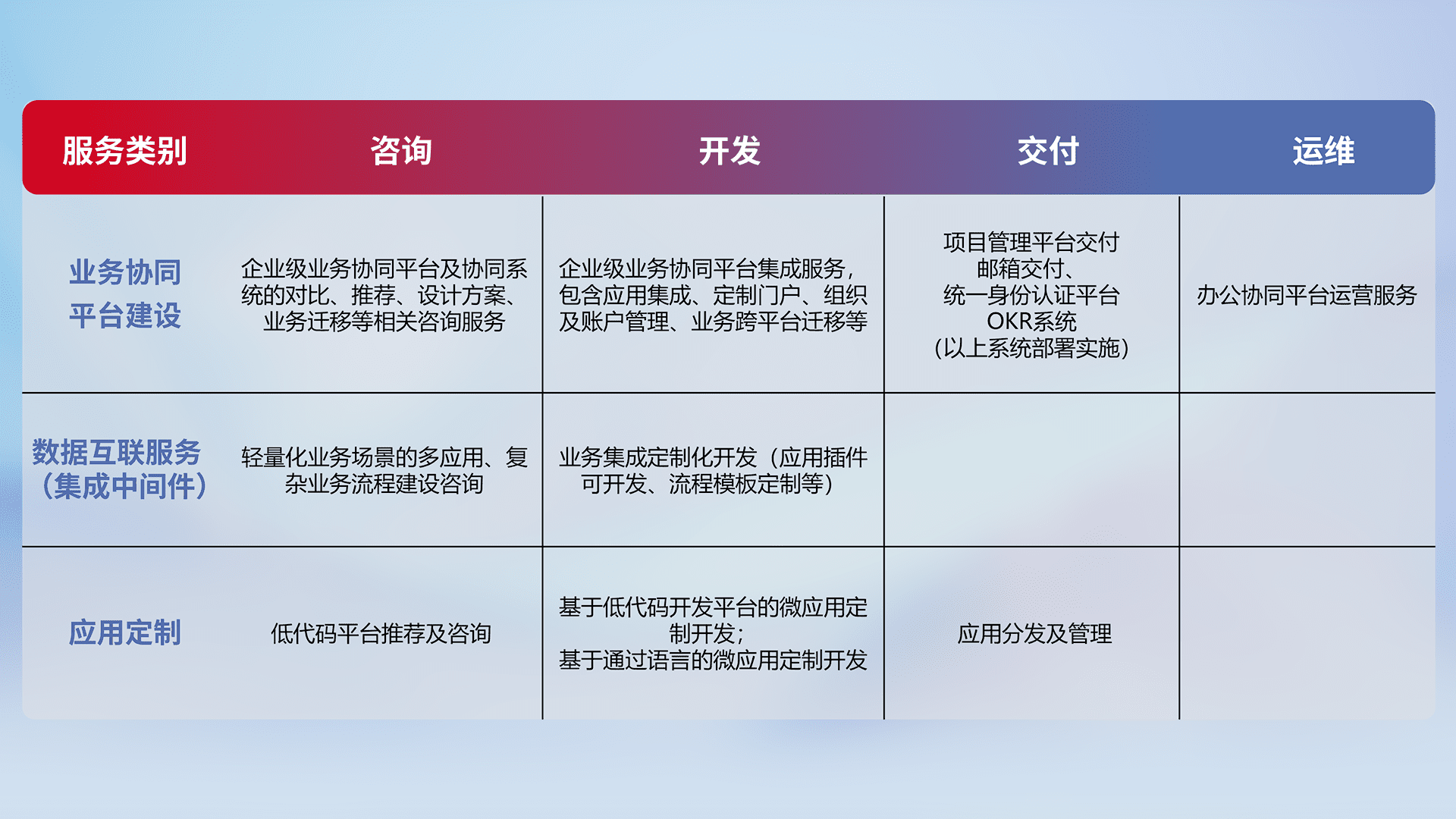 针对钉钉、、、、企微、、、IDaas等平台级产品提供产品的规划、、、方案、、、交付、、、定制化开发等服务,,实现如统一协同办公、、、、智能客户服务、、混合会议管理、、、智能数据查询、、、等业务场景,,,,实现数字化转型。。。。